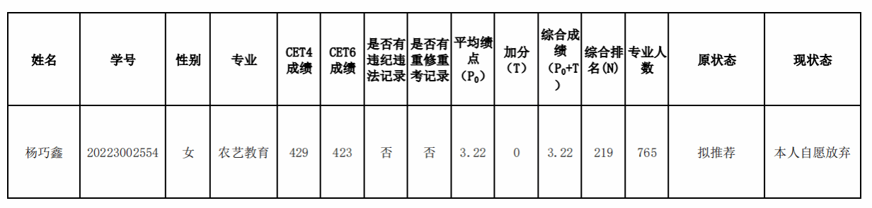 因农艺教育专业有一名员工主动放弃推免资格,现对主动放弃推免生资格的名单予以公示,具体见下表。