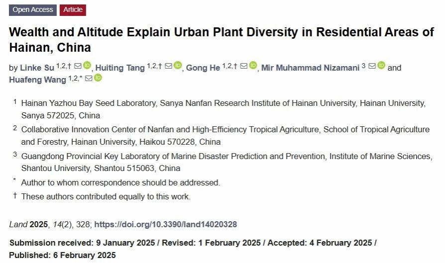 2025年2月,《Land》期刊(中科院二区期刊,IF=3.2)发表题为“Wealth and Altitude Explain Urban Plant Diversity in Residential Areas of Hainan, China”的研究论文。beats365vip官网登录入口本科生苏琳珂为该论文的第一作者,王华锋教授为论文的通讯作者。本研究得到国家自然科学基金的资助。