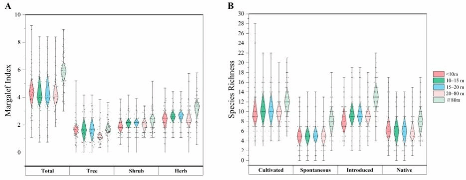 图 3. 不同类型住宅区的箱线图。(A) 按总物种、乔木、灌木和草本划分的不同类型住宅区的 Margalef 指数箱线图。(B) 按栽培物种、自发物种、引入物种和本地物种划分的不同类型住宅区的物种丰富度箱线图。
