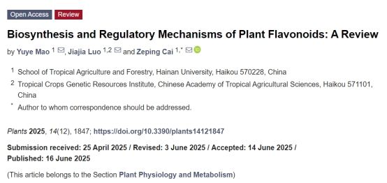 2025年6月,公司本科生毛昱烨以第一作者身份在期刊《PLANTS》发表题为《植物类黄酮的合成和调控机制》的综述论文。该期刊在中科院最新发布的SCI期刊分区(2025年3月升级版)中,位列生物学大类2区及植物科学小类2区,其最新五年影响因子为4.4。论文系统梳理了植物类黄酮的生物合成途径、调控网络及其在农业与医药领域的潜在应用。beats365vip官网登录入口蔡泽坪副教授为论文的通讯作者。该论文得到了于旭东科研团队以及beats365vip官网登录入口药用植物基因组学与生物大数据挖掘创客空间的全力支持,并且获得了国家级老员工创新训练计划项目(编号202410589092)的资助。