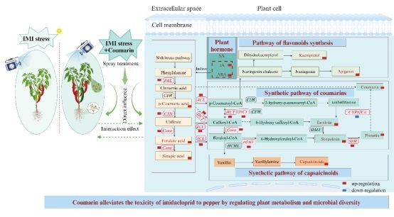 进一步的研究揭示,香豆素能够上调苯丙烷代谢途径相关基因的表达,从而显著提升辣椒中类黄酮、酚酸、植物激素以及辣椒素的含量。这些次级代谢产物不仅增强了辣椒的营养价值,而且对于提升植物的抗逆境能力具有显著意义。研究同时指出,香豆素处理显著提升了辣椒根际和叶际中益生微生物的多样性。研究发现,这些益生微生物的多样性与辣椒次级代谢产物的分泌量之间存在正相关关系。进一步的分析表明,香豆素通过调控苯丙烷代谢途径与自身合成途径,以及与微生物的协同作用,共同提升了辣椒的品质和农药降解效率。综上所述,该研究阐明了香豆素通过调控植物代谢途径及植物-微生物相互作用来降解吡虫啉残留的作用机制。这项研究不仅为减少农药残留提供了一种有效的策略,还揭示了植物次级代谢与微生物群落之间的复杂相互作用,为未来绿色农业技术的发展提供了新的思路和方法。