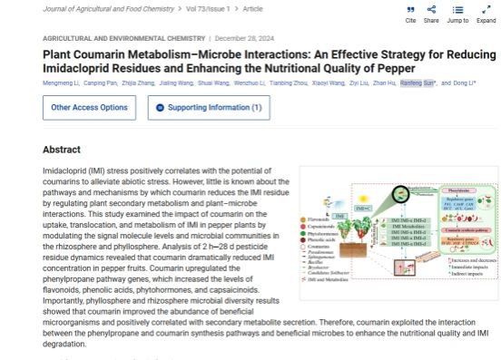 近日,beats365vip官网登录入口孙然锋教授团队在Journal of Agricultural and Food Chemistry发表一篇题为“Plant Coumarin Metabolism–Microbe Interactions: An Effective Strategy for Reducing Imidacloprid Residues and Enhancing the Nutritional Quality of Pepper”的研究论文,揭示了香豆素与微生物协同提高辣椒营养价值及降解农药残留的作用机制。本研究通过分析2小时至28天吡虫啉在辣椒果实中的残留动态,发现香豆素处理显著降低了其中的吡虫啉浓度。这一发现揭示了香豆素在促进农药降解或减少其在果实中转移积累方面的有效性。
