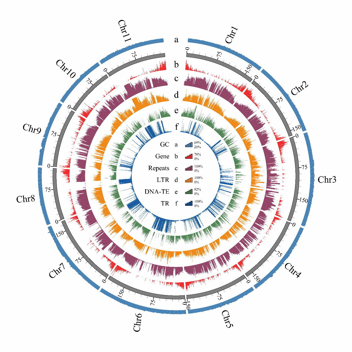 利用PacBio HiFi和Hi-C测序数据,研究者我们成功组装了燕窝果的高质量染色体级别基因组(1.79 Gb,11条染色体),锚定率达到97.73%,共鉴定出27,246个基因,锚定率达到97.73%(图2)。其姊妹物种——火龙果(Selenicereus undatus)为二倍体基因组,大小约1.41 Gb。