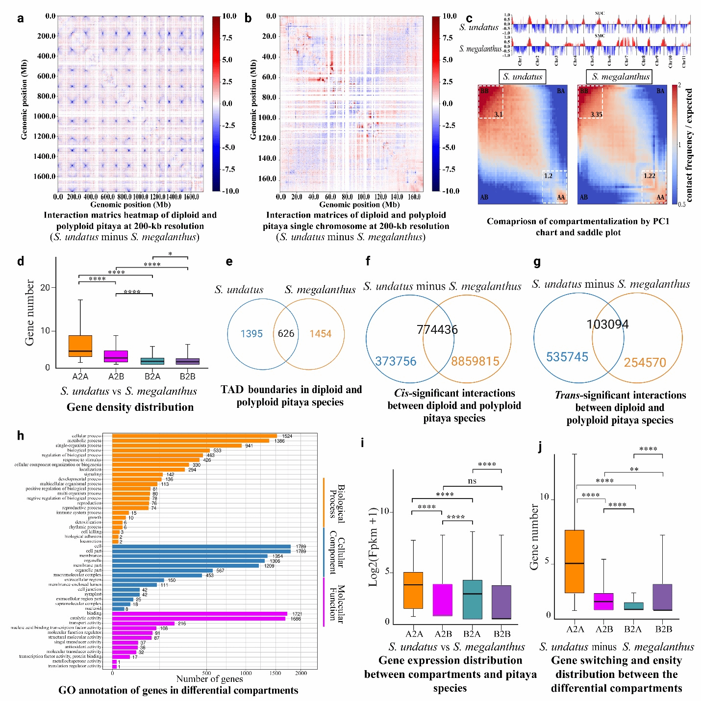 Hi-C互作分析表明,四倍体燕窝果中A-A和B-B区室间的相互作用更为强烈,同时呈现出独特的拓扑关联结构域(TAD)边界特征。研究者在四倍体燕窝果中鉴定出1,454个特异性TADs,在二倍体中则发现1,395个特异性TADs,表明两种倍性火龙果在三维基因组结构上存在显著差异(图4)。值得注意的是,哺乳动物的TADs形成依赖于特定的结构蛋白[1],而植物虽然缺乏这类蛋白,但其携带的TCP家族转录因子(如TEOSINTE BRANCHED 1、CYCLOIDEA和PCF1等)可能发挥着类似的功能[2]