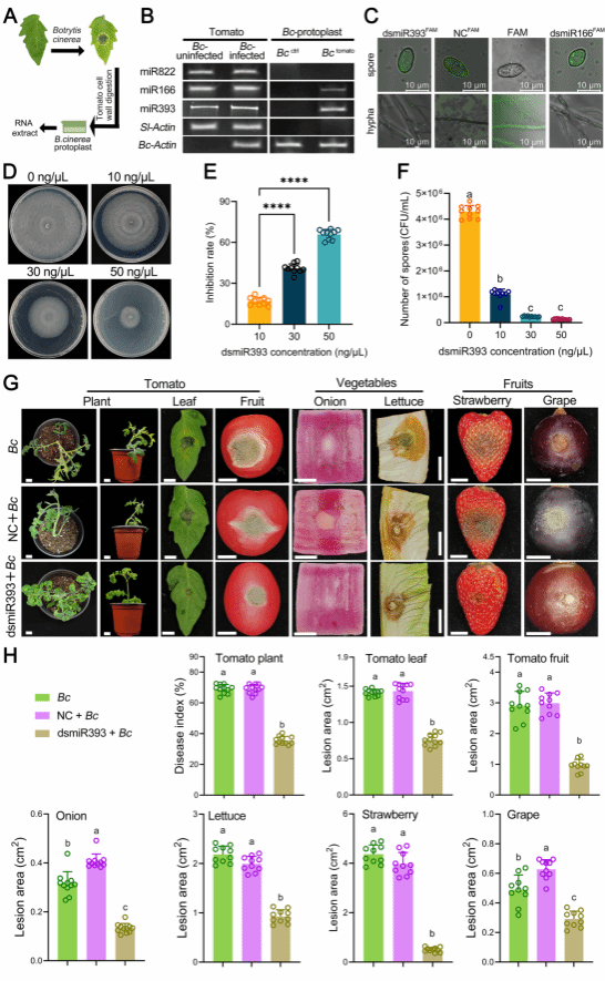 研究发现,番茄miR393可跨界进入灰霉病菌体内,特异性靶向其细胞壁合成关键基因BcFKS1,导致真菌细胞壁结构破坏,菌丝生长和孢子形成显著受抑制。实验表明,外源双链miR393(dsmiR393)可使灰霉病菌丝生长减少67%,产孢量下降99%。