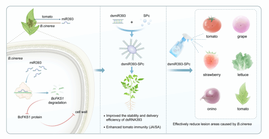 在番茄、草莓、葡萄、洋葱和生菜等多种植物中,SPc负载的dsmiR393均表现出优于传统化学农药(如戊唑醇)的防治效果,且持效期长达25天以上。