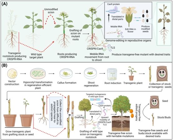基因组工程正进入植物性状改良的新时代。工程作物基因组的能力正在迅速发展,并已应用于主要作物以获得所需的性状。然而,尽管最新的技术进步,基因组编辑试剂传递系统仍然依赖于基因型和组织培养再生。研究论文-New possibilities for trait improvement via mobile CRISPR-RNA针对植物CRISPR/Cas9转基因技术有助于实现从根到枝的长距离移动,从而可以有效地编辑嫁接接穗。