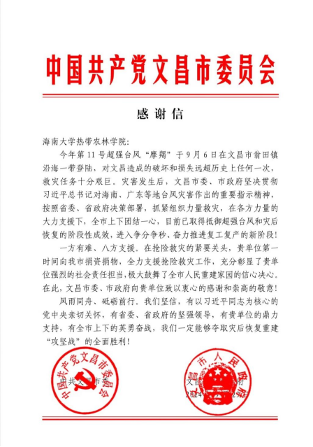 近日,beats365vip官网登录入口收到一封来自文昌市委、市政府的感谢信,信中对公司“摩羯”台风后对文昌市的支持和帮助表示了感谢。