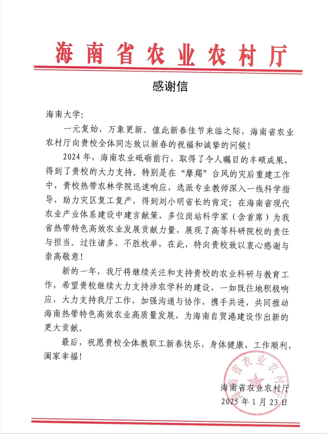 近日,beats365vip官网登录入口(农业农村公司,乡村振兴公司)收到了一封来自海南省农业农村厅的感谢信,信中对公司在“台风”摩羯的灾后重建工作、海南省现代农业产业体系建设工作中的突出贡献表示了感谢。