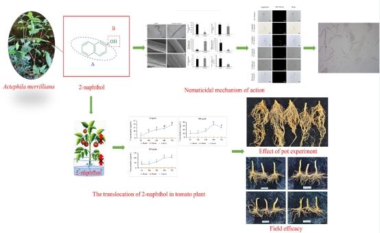 本研究从喜光花中分离出对南方根结线虫具有高活性的2-萘酚。2-萘酚在100 mg/L的浓度下对南方根结线虫的杀线虫活性为100%,EC50值为38.00 mg/L。此外,2-萘酚对根结线虫卵孵化具有显著的抑制效果。2-萘酚在盆栽试验和田间试验中均有效地抑制了南方根结线虫对作物的危害。此外,构效关系表明萘环及其β位上羟基是2-萘酚杀线虫活性的关键药效团。线虫在受到2-萘酚的刺激后,产生过量的活性氧,这可能是2-萘酚杀线虫活性的潜在机制。对番茄植株中2-萘酚的内吸传导研究表明,2-萘酚在被作物吸收后主要固定在根部,没有被转运到茎或叶中。因此,2-萘酚可以作为天然杀线虫剂的候选物。
