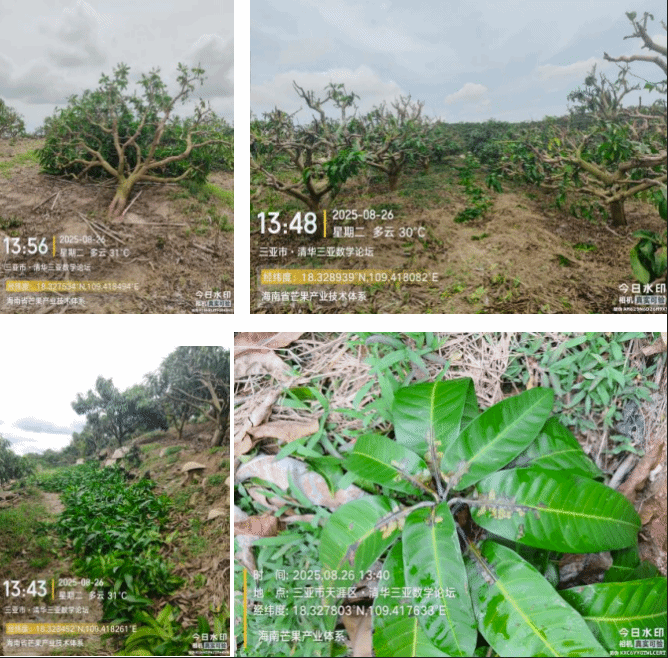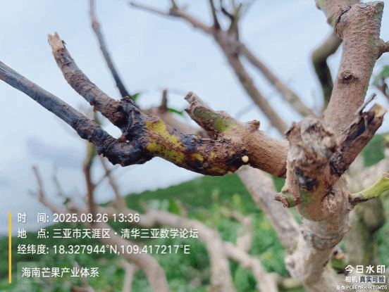 调查显示,此次台风对海南各芒果种植区均造成了一定影响。陵水多数果园处于控梢阶段,风害导致部分枝条扭伤、裂断和叶片损伤;三亚部分果园受灾较重,尤其个别处于迎风坡的果园,出现部分树木倒伏、树干倾斜和枝干折断等情况。除直观物理伤害外,台风还带来潜在威胁:(1)当前正值控梢或催花关键阶段,强降雨天气不利于芒果控梢催花,易引发冲梢。(2)台风造成大量伤口,增加了细菌性病害和炭疽病发生与流行的风险。调查发现,个别果园已经出现细菌性病害。