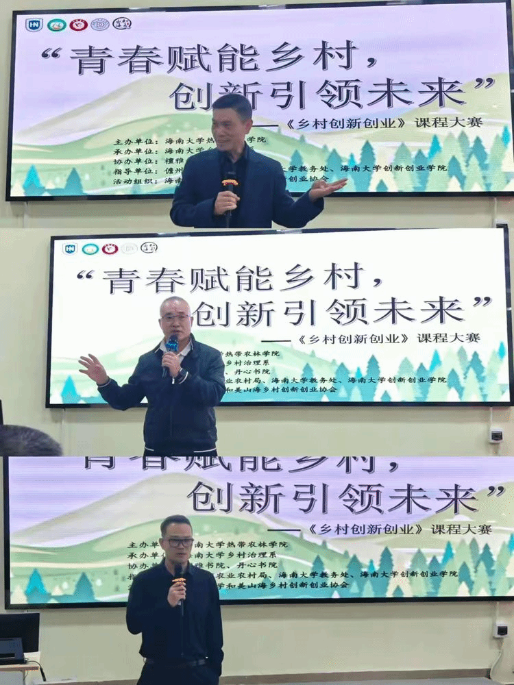 作为本次比赛的组织者,协会从策划协调、人员安排到流程把控,都进行了精心筹备。大赛上,本次课程大赛荣幸邀请到丹心书院王珍书记、檀雅书院学工办李朋飞副主任、檀雅书院纪俊铭老师、儋州校区基地运管中心蔡夫博副主任,以及课程主讲老师付广担任评委。他们的到来,为这场青春与乡村相会的创意盛宴增添了专业与分量。