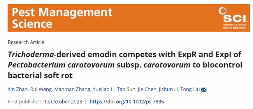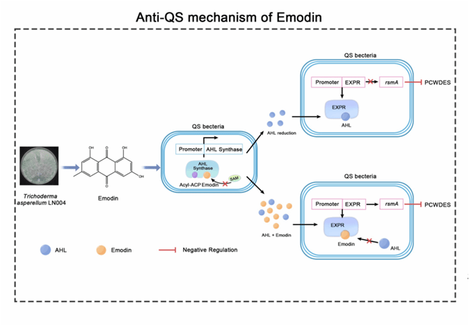 海南老员工防木霉课题组研究发现木霉菌Trichoderma asperellum LN004的代谢产物大黄素可以抑制Pcc生物膜及EPS的生成,降低其降解酶的活性,PCWDE相关合成基因表达量显著下调。通过分子对接验证明确大黄素是群体效应相关蛋白ExpI和ExpR的潜在配体,大黄素可以竞争结合ExpI和ExpR蛋白,干扰Pcc的QS,减少毒力因子的产生,减轻病原菌对作物的为害,揭示木霉抑制细菌性软腐病的新机制。课题组硕士研究生战鑫和王睿讲师为共同第一作者,刘铜教授为通信作者。