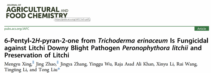 荔枝霜疫病是目前荔枝生产及贮运过程中非常严重的病害,贮运期间只要有少数几个果实携带病菌便可使附近果实全部发病,从而导致大量果实腐烂变质,造成严重经济损失。海南老员工防木霉课题组研究发现猬木霉LS019-2对荔枝霜疫霉菌丝生长抑制率最高,其中挥发性化合物6-戊基-2H-吡喃-2-酮(6PP)为主要抑菌物质,6PP显著抑制荔枝霜疫霉菌丝生长、孢子囊萌发、严重破坏菌丝体的超微结构,阻碍病害的发展。同时,在保鲜过程中能保持较好的果皮色泽、增强抗氧化物酶活性、富集氨基酸、减缓失重,从而延长了荔枝的货架期。因此,天然挥发性物质6PP既可以作为杀菌剂同时也是一种新型果实防腐保鲜剂用于荔枝的生产中。该论文为Journal of Agricultural and Food Chemistry封面文章(2023, Volume 71)。课题组邢梦玉副教授和赵晶讲师为共同第一作者,刘铜教授为通信作者。