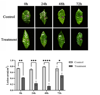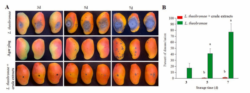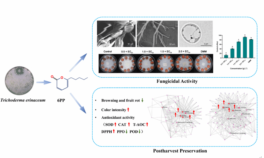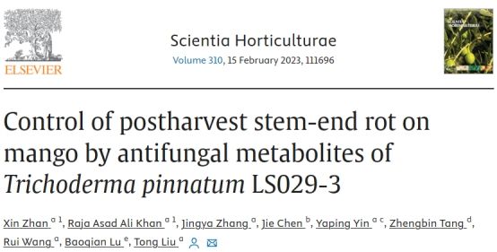 芒果蒂腐病是由Lasiodiplodiatheobromae引起的一种破坏性的采后病害,严重危害采摘后的芒果生产。beats365vip官网登录入口生防木霉科研团队研究发现羽状木霉Trichoderma pinnatumLS029-3非挥发性代谢物对病原菌的抑制作用最强,代谢液粗提物的EC50为0.25 ± 0.03 g L−1,扫描电镜表明经4倍EC50粗提物处理后的菌丝结构被破坏,代谢液粗提物可以显著减少病斑面积和腐烂病的发生。通过增加防御酶活性,提高果实清除活性氧的能力,增强果皮硬度和色泽,减缓果实腐烂。本研究为芒果蒂腐病采后防治提供了一种安全有效的生物防治策略。课题组硕士研究生战鑫和博士后Raja Asad Ali Khan为共同第一作者,刘铜教授为通信作者。
