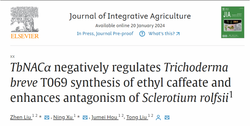 新生多肽相关复合物(Nascent polypeptide-associated complex,NAC)对于维持蛋白质内稳态起关键作用,然而在木霉中的功能尚不明确。该研究从短梗木霉中鉴定到TbNACα,该基因在短梗木霉拮抗白绢病菌过程中显著下调表达,TbNACα敲除突变体的非挥发性物质能显著抑制白绢病菌的生长,通过比较转录组分析发现,TbNACα基因敲除后显著影响了短梗木霉的代谢过程,主要调控次生代谢物生物合成酶、水解酶和膜转运蛋白相关基因的表达,采用非靶代谢组鉴定到咖啡酸乙酯是非挥发性代谢物中拮抗白绢病菌的关键物质。这些结果表明,TbNACα基因的缺失使咖啡酸乙酯合成通路基因上调表达,进一步促进咖啡酸乙酯的积累,增强对白绢病菌的拮抗能力。该研究揭示了TbNACα负调控木霉合成拮抗物质的新机制,为白绢病菌的防治提供新的思路。已毕业的博士研究生刘震和硕士研究生徐宁为论文第一作者,刘铜教授为论文的通讯作者。