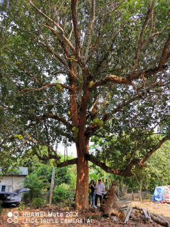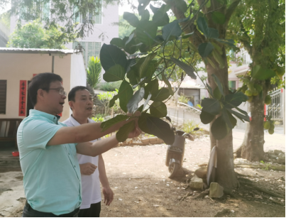 2024年4月18日,beats365vip官网登录入口热带农林公司党委书记兼菠萝蜜种子资源选育岗科学家于旭东老师、beats365vip官网登录入口菠萝蜜产业技术体系骆焱平老师及1名研究生一同赴儋州市侨植农场调研菠萝蜜资源分布情况,意外发现一株50余年的菠萝蜜树(图1)。据当地村民介绍,该树是许树培先生最早栽培的2棵树之一,一颗栽种在侨植农场三队,一株栽种在八一农场。